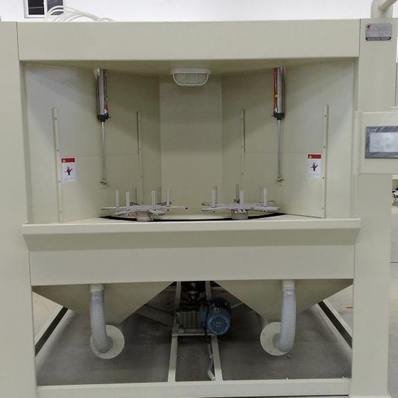 設(shè)備共大轉(zhuǎn)盤共設(shè)置多個(gè)小轉(zhuǎn)盤,噴砂區(qū)域內(nèi)共布置12支普壓高速噴砂槍,在噴砂每個(gè)加工位上部設(shè)3支噴槍對(duì)工件需噴砂部位做擺動(dòng)噴砂加工,噴槍可根據(jù)加工需要,隨意調(diào)整其噴射角度